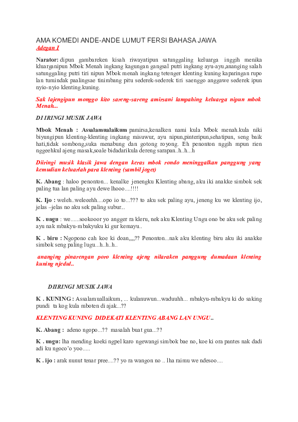Kelestarian Budaya Orang Melayu Keturunan Jawa Dan Ande Ande Lumut Adalah Cerita Rakyat Yang Berasal from demo.pdfslide.net Cerita ini dikenal berbagai versi. Versi yang banyak dikenal dan tradisional adalah yang mengaitkannya dengan bersatunya (kembali) kerajaan jenggala dan kediri. Teks drama ande ande lumut singkat ini dapat anda jadikan referensi untuk mengerjakan tugas sekolah, baik untuk pemain 7 orang maupun 6 orang. About press copyright contact us creators advertise developers terms privacy policy & safety how youtube works test new features press copyright contact us creators. Mereka silih berganti mendatangi ande ande lumut. More images for ande ande lumut bahasa jawa » Sep 02, 2019 · konon dahulu kala, di desa dadapan, pulau jawa ada seorang janda yang hidupnya sederhana, bernama mbok rondo. Dalam naskah drama ande ande lumut dalam bahasa jawa singkat, ini anda dapat membukanya di sini (naskah drama ande ande lumut bahasa jawa singkat).